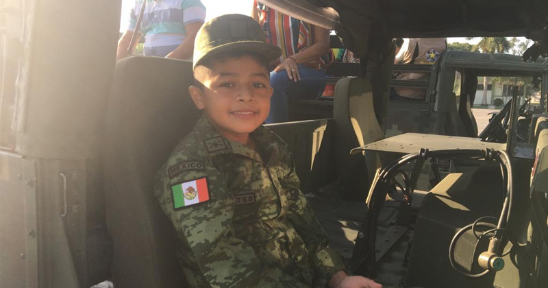 El niño que estudia el quinto año de primaria en la primaria «Carlos A. Riestra y quien padece distrofia muscular de Duchene llegó acompañado de sus padres Lorena Izaguirre y Eduardo Fuentes para que después le fuera entregado su uniforme de soldado.