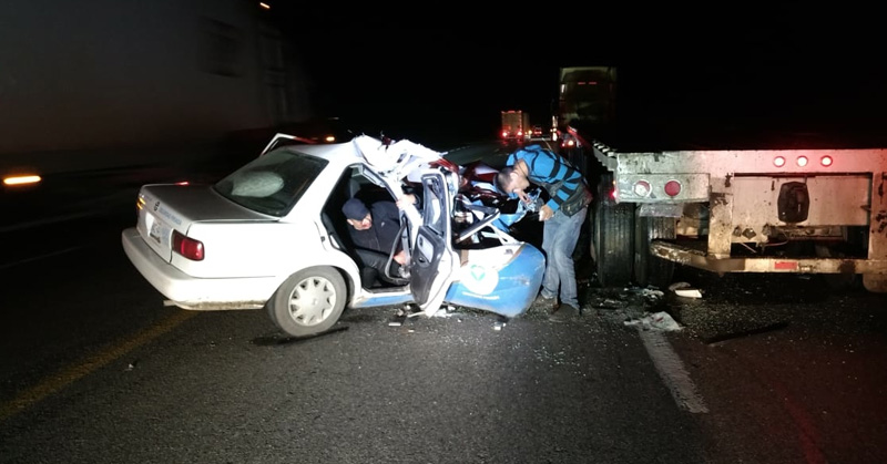 Dos empleados de una empresa de Coahuila casi pierden la vida al estrellarse de lleno contra la plataforma de un tráiler parado en el acotamiento