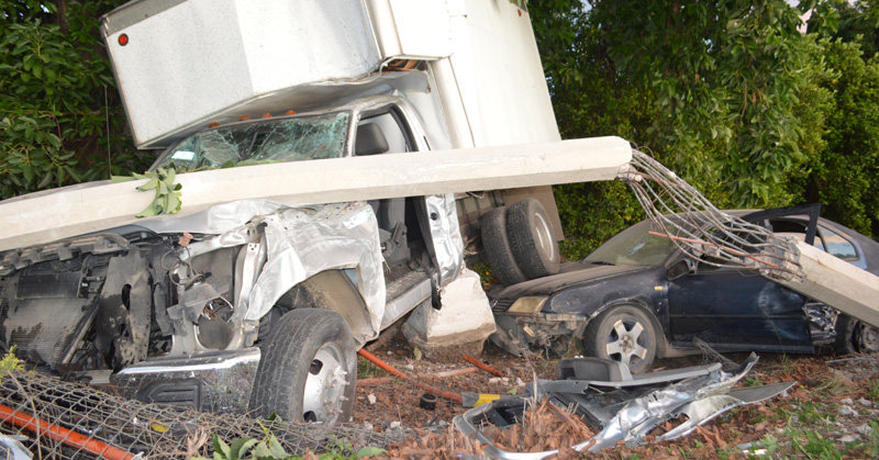 De manera casi milagrosa salieron ilesos de un aparatoso percance carretero tanto una familia, como el chofer de una camioneta de caja: chocan, tumban postes y 25 metros de malla ciclónica