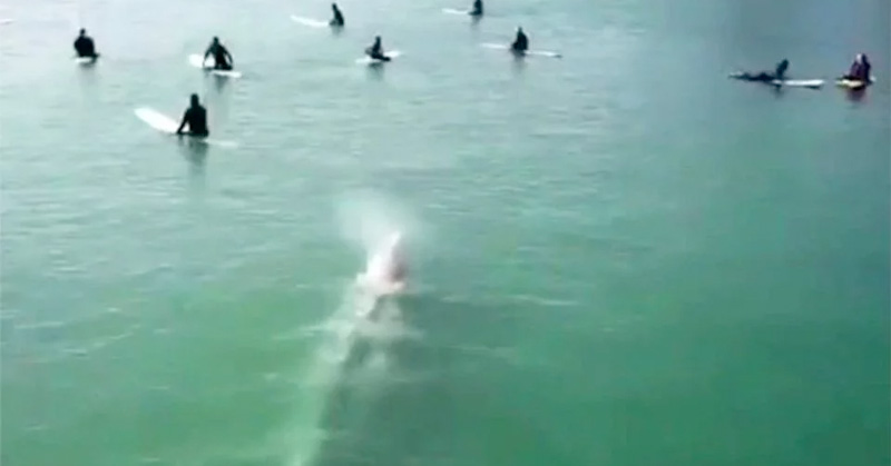 El gran mamífero se presentó implacable debajo de los surfistas quienes no pudieron sino permanecer quietos a que pasara