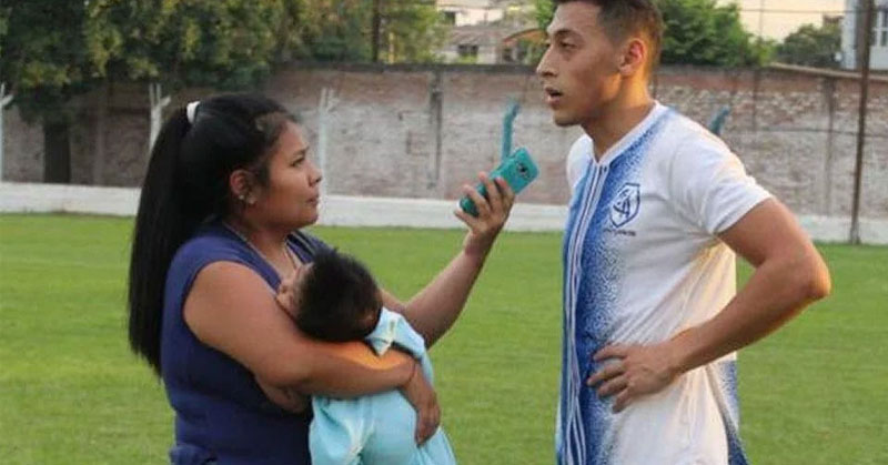 Cuidar a su bebé no impidió que Cecilia Tapia pudiera realizar su trabajo y es que con su hijo en brazos realizó entrevistas al finalizar las semifinales de la Liga Regional de Futbol de Libertador.