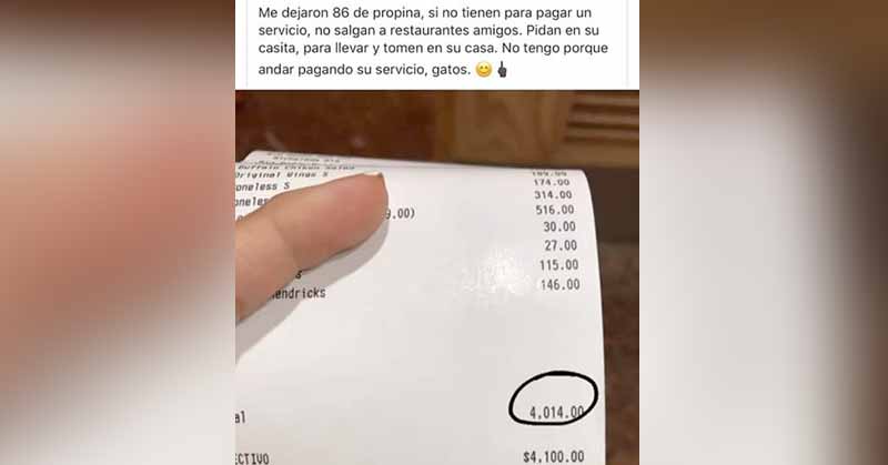 Una mesera publicó un ticket de la cuenta de un cliente por 4 mil pesos, y le dejaron 86 pesos de propina; usuarios de redes la critican