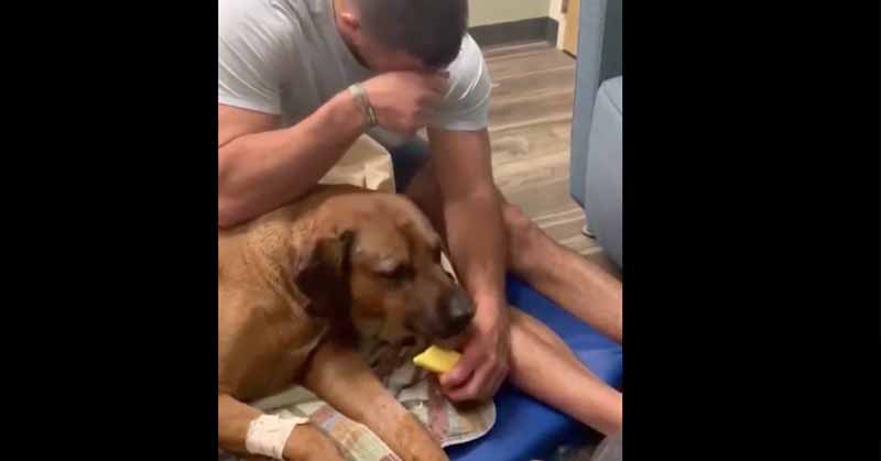 Entre lagrimas un hombre alimenta a su perro por última vez