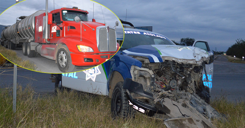 Sobreviven policías a encontronazo carretero: chocan con una pipa de doble remolque al quedarse sin frenos, la patrulla fue declarada pérdida total.