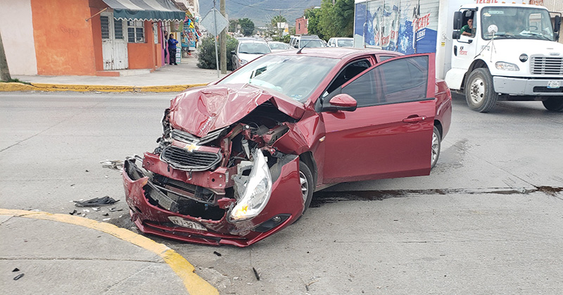 Camioneta repartidora de frituras cruza el eje vial con el semáforo en rojo y es embestido por un coche último modelo que fue declarado pérdida total.