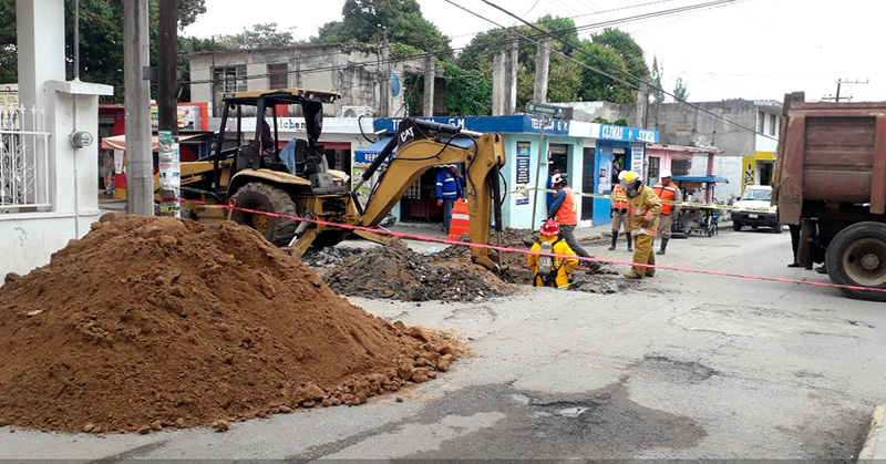 Reparaban el drenaje cuando rompen el tubo con el combustible y origina tremenda fuga por lo que evacuaron 25 negocios y cerraron una calle.