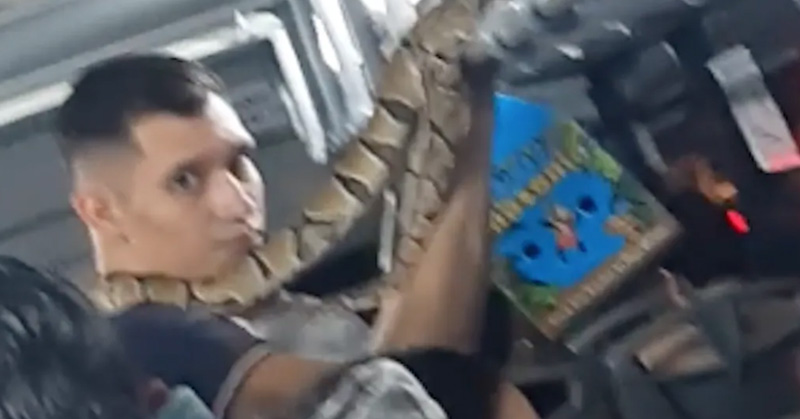 Las imágenes fueron grabadas el pasado viernes 24 de enero, en un camión de la ruta 223, en donde los pasajeros se sorprendieron al ver que uno de los pasajeros abordó la unidad con una pitón enredada en el cuello y parte de sus brazos.
