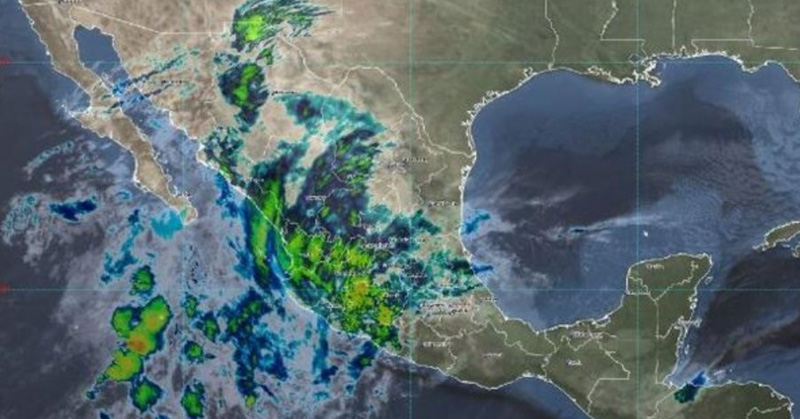 Pacífico Centro: Cielo nublado con lluvias puntuales muy fuertes en Nayarit, fuertes en Jalisco, así como intervalos de chubascos en Michoacán y Colima. Ambiente cálido y viento de dirección variable de 10 a 25 km/h en la región, con rachas de 40 km/h en Jalisco.