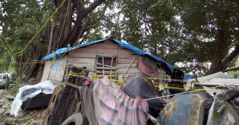 Una vivienda de madera y cartón de la colonia Tinaco está sujetada con lazos de un árbol, se calcula que en Ciudad Madero hay un promedio de 6 mil casas construidas con material precario.