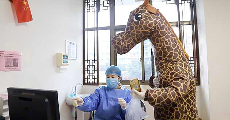 Va disfrazada de jirafa al hospital al no conseguir mascarilla