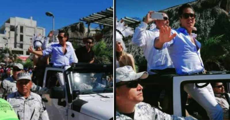 Aparece el histrión a bordo de un Jeep descapotable color blanco, saludando a los asistentes del carnaval, mientras los elementos de la GN y policías municipales caminan en los costados del vehículo
