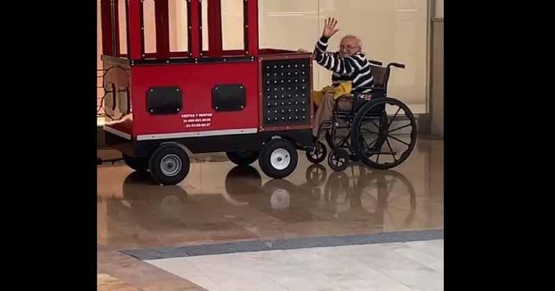VIDEO. Abuelito en silla de ruedas pasea encantado en trenecito