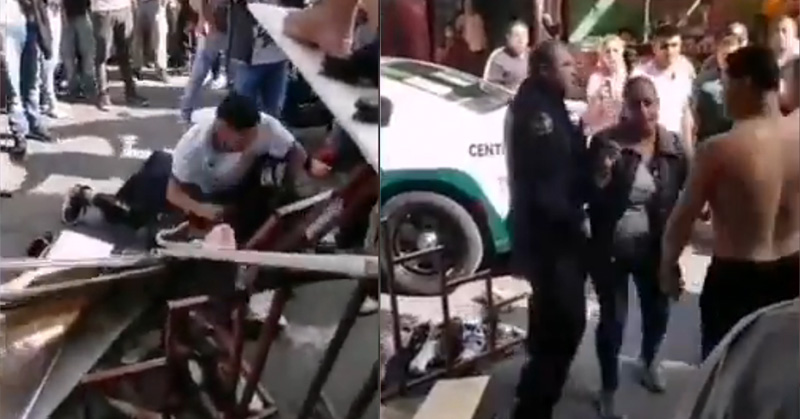 Cuando son separados el policía busca la pistola en el piso y un curioso la levanta del suelo.