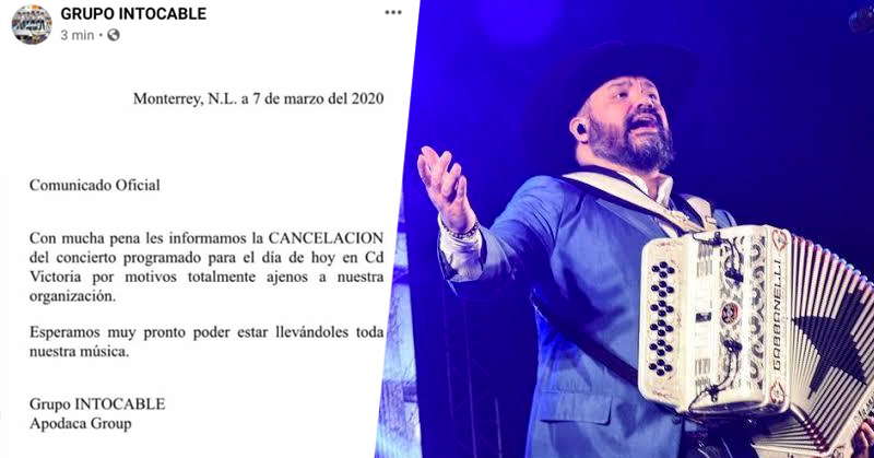 El Grupo Intocable anunció la cancelación del concierto que tendrían esta noche en el Centro de Espectáculos Victoria.