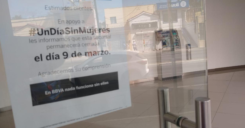 En la puerta principal la institución bancaria tiene un aviso para todos los usuarios en donde señala que en apoyo a #Undíasinmujeres la sucursal permanecerá cerrada el 9 de marzo.