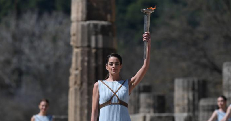 En el sitio arqueológico donde se llevaron a cabo los primeros Juegos de la antigüedad, la actriz griega Xanthi Georgiou, vestida como una antigua sacerdotisa, encendió la llama de forma tradicional.