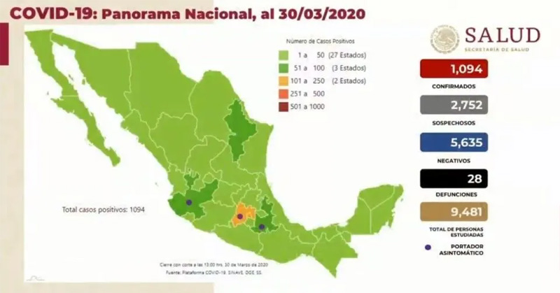 Esta tarde se dio a conocer que la cifra de contagios en México asciende a 1,094 casos y 28 fallecimientos.