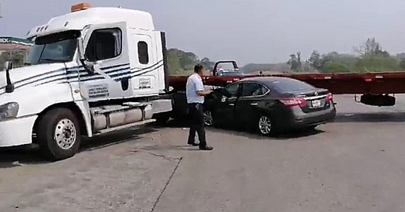 Imprudente trailero da vuelta prohibida, chofer del coche burla de la muerte