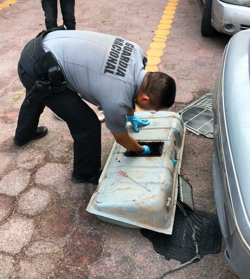Al realizar una revisión a la unidad, los guardias nacionales detectaron un fuerte olor a gasolina y se percataron que en la parte trasera del tanque de combustible había un cuadro hecho de manera artesanal, que ocultaba seis paquetes de forma irregular envueltos en plástico con el armamento.