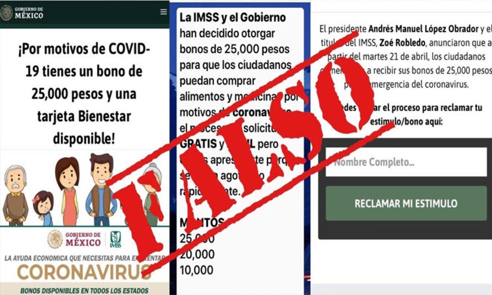Existen diversas modalidades de estas estafas, pues primero la liga llega por medio de mensajes de Whatsapp, que mandan a una página de Facebook, donde con imágenes apócrifas del IMSS recolectan datos personales y piden un “bono de apartado, que será reembolsado al momento de establecer el monto del crédito que te brindan”, o dos, mediante una liga falsa que lleva a un formulario donde se ingresan datos personales a los que se les puede dar mal uso.