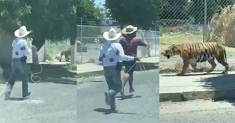 En el material se observa como tres hombres, uno vestido de charro, y una camioneta, van justo detrás del animal para intentar atraparlo.