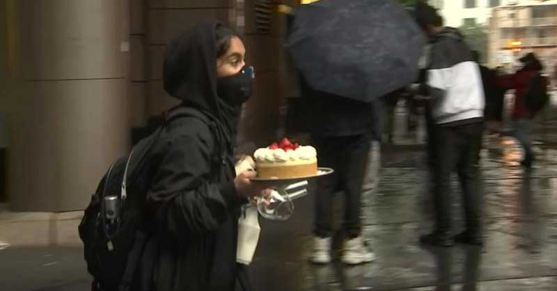 Una manifestante fue captada con un pastel de queso y dos copas de cristal en mano