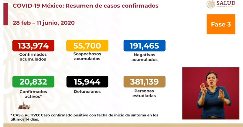 La Secretaría de Salud reportó que el país acumula 133,974 contagios y 15,944 decesos por COVID-19.