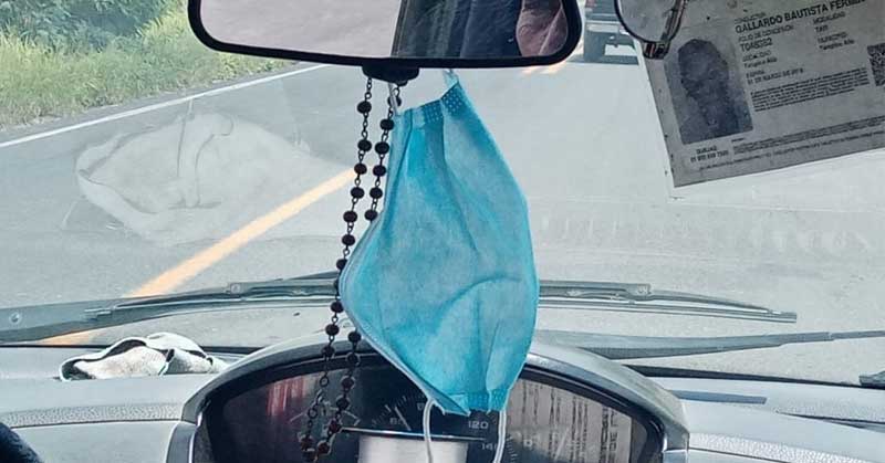 Van colgados en el espejo retrovisor a la vista de los pasajeros.