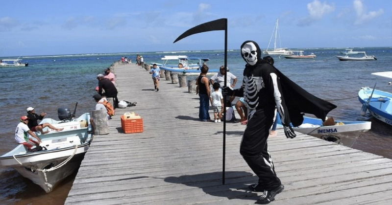 «La muerte» apareció en las playas de Quintana Roo para recordarles a los turistas que aún existen altos riesgos de contagio en México