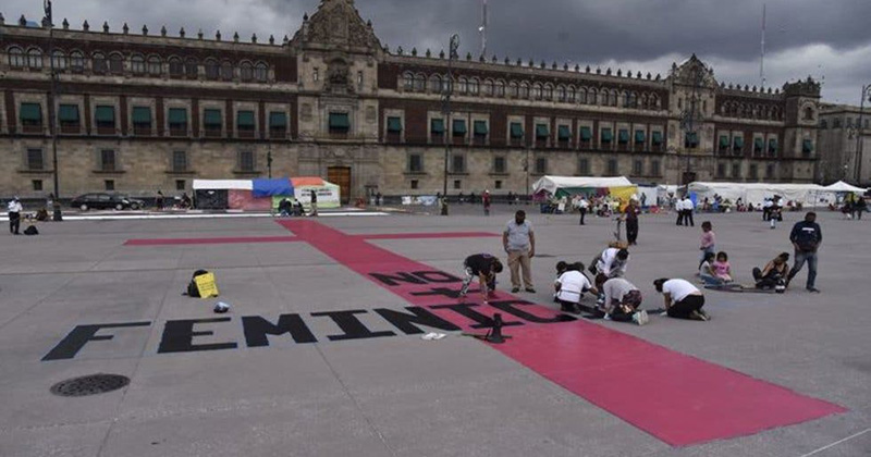 Las inconformes pintaron una cruz color rosa de más de 30 metros frente a la plancha del Zócalo con la leyenda “No + feminicidios”