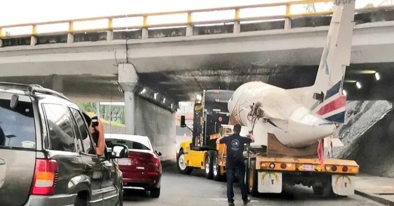 Un tráiler que remolcaba un avión se atoró en un bajo puente sobre Viaducto Tlalpan, lo que ocasionó intenso tránsito
