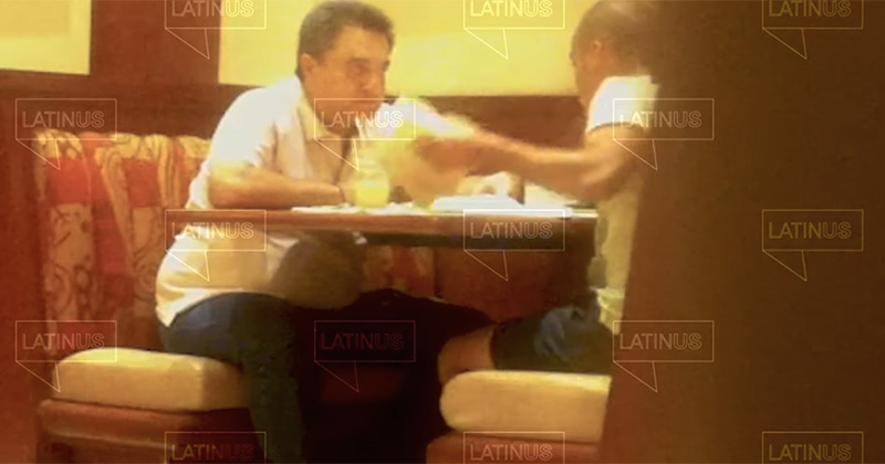 Videos publicados por Latinus muestran a David León entregar sobres con billetes a Pío López Obrador, que supuestamente irían para las campañas