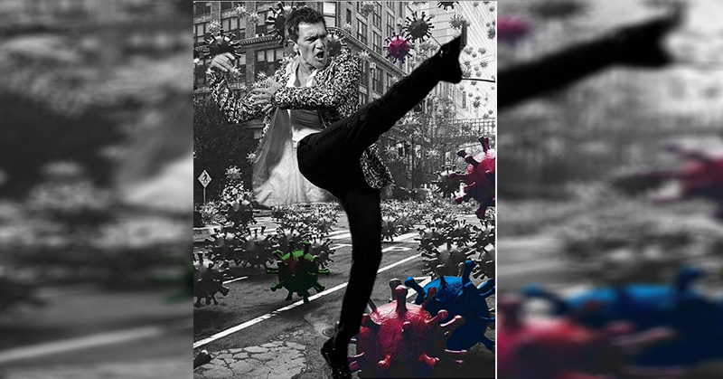 El actor acompañó el comunicado con una imagen en blanco y negro en la aparece rodeado de supuestos virus a los que lanza una patada