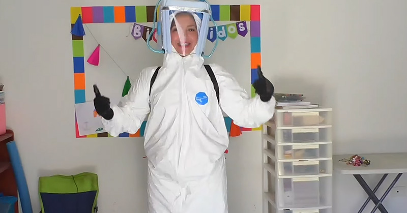 Usó todos los implementos de un equipo de protección personal y los transformó en un disfraz con el que visitó a sus alumnos