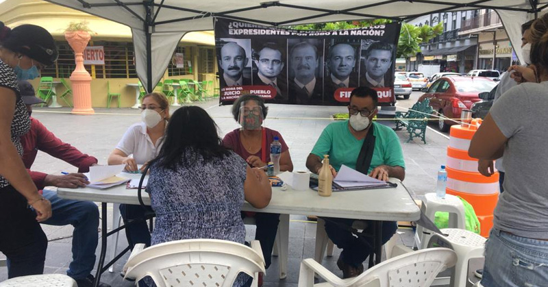 Dos módulos fueron instalados en la plaza de armas de Tampico con la finalidad de recabar firmas de ciudadanos que apoyen la iniciativa de llevar a juicio a cinco expresidentes de México.