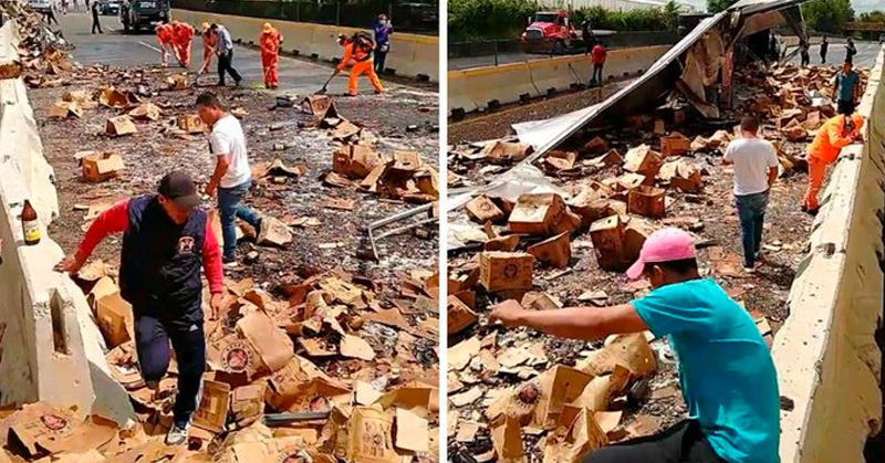 Un camión que transportaba cervezas se volcó en la autopista Tenango-Ixtapan y los pobladores cercanos comenzaron la rapiña del liquido