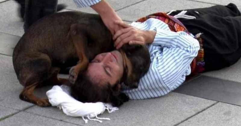El perro se angustió al ver a un hombre tirado en el suelo y se acercó para acompañarlo y darle amor.