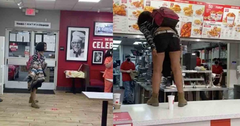En los videos puede verse a la mujer cuando se sube enojada a la barra donde entregan la comida y grita que la atiendan porque tiene mucha hambre
