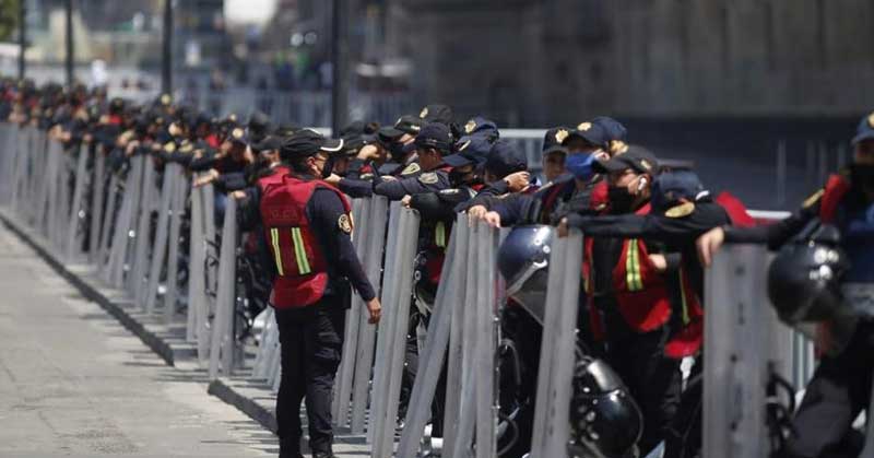 Elementos se encuentran montando guardia en las vallas metálicas para evitar que los inconformes avancen al recinto.