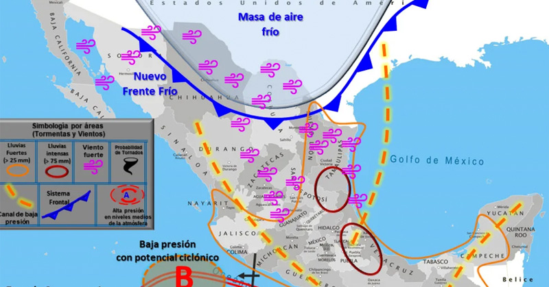 La masa de aire frío que impulsa al sistema cubrirá gran parte del territorio nacional, ocasionando descenso de temperatura en Coahuila, Chihuahua, Nuevo León y Tamaulipas.
