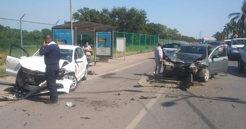 TAMPICO, TAMAULIPAS.- Destrozados de su parte frontal terminaron dos automóviles particulares al chocar de frente en el bulevar Adolfo López Mateos, frente al aeropuerto Francisco Javier Mina.