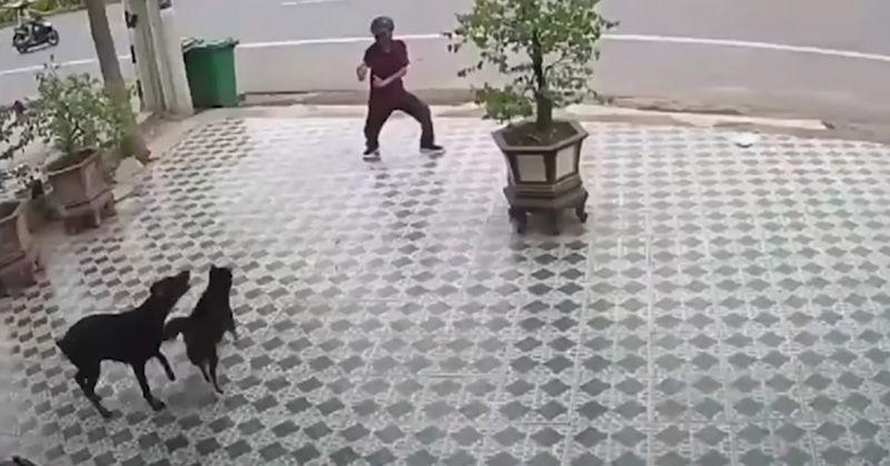 A pesar de no ser un profesional e improvisar los movimientos, este hombre se salvó de unas buenas mordidas tras intimidar a un par de canes con sus movimientos