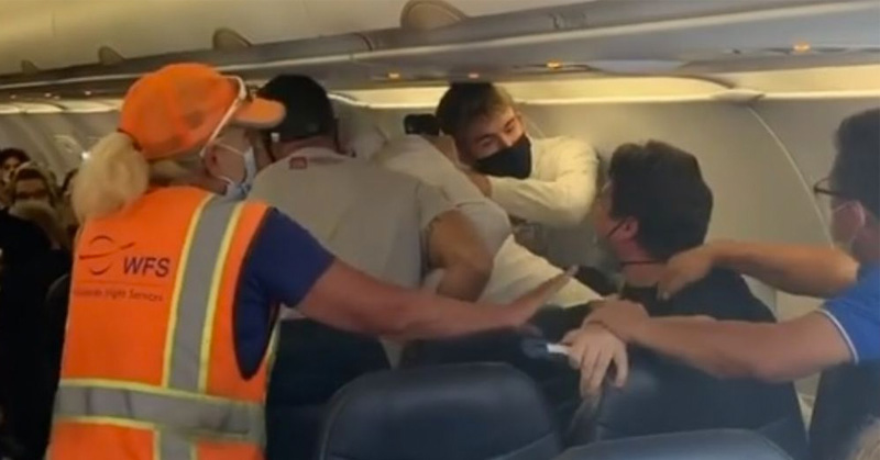 ¡Hay tiro! Pasajeros de un avión pelean por un cubrebocas