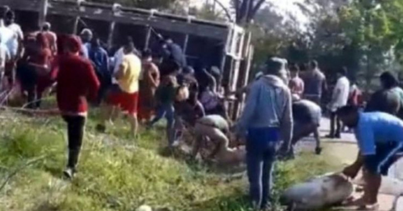 Videos que circulan en redes muestran cómo cientos de pobladores mataron a un grupo de cerdos que volcaron de un camión.