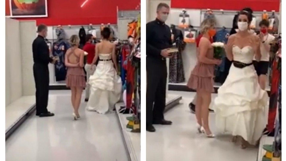 Una mujer vestida de novia entró al trabajo de su pareja acompañada de una dama de honor y un sacerdote, buscaba casarse en ese instante tras dos años de haber recibido el anillo.