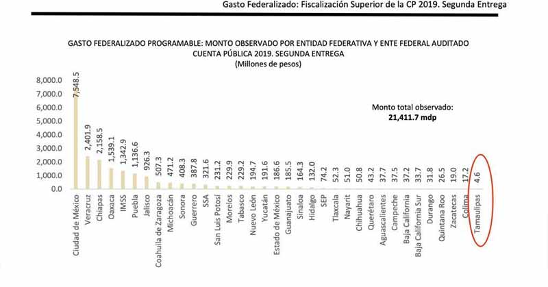 De acuerdo al resultado de las auditorías realizadas a los estados del país en relación al gasto federalizado, Tamaulipas es la entidad con el nivel más bajo de gasto observado durante 2019