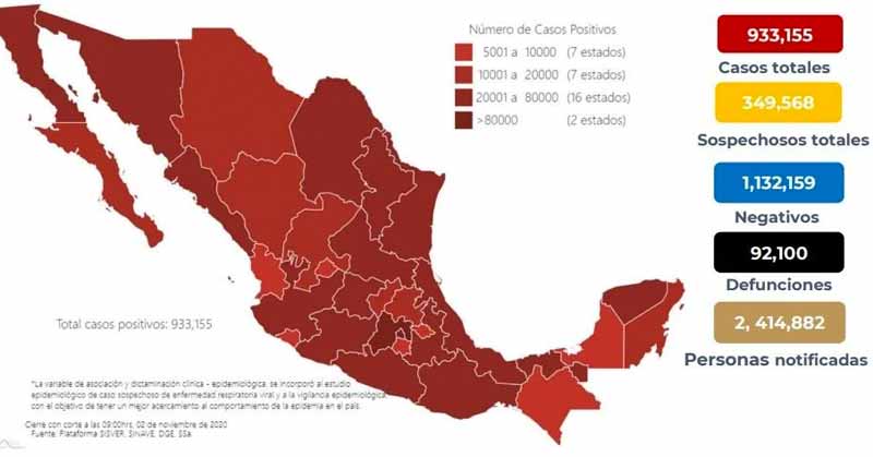 México supera los 930 mil casos de COVID y 92 mil defunciones