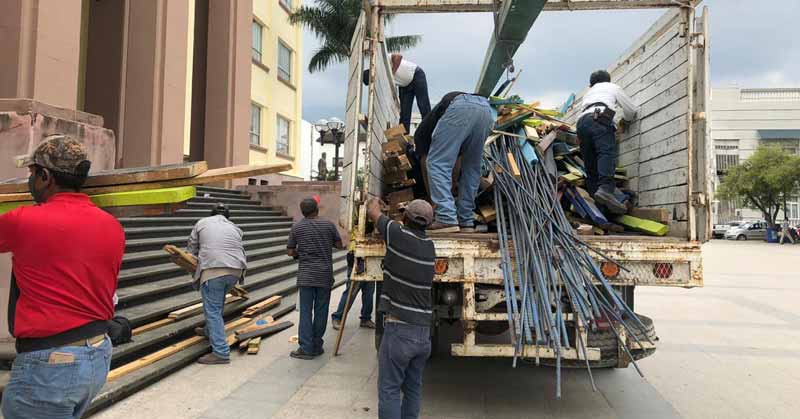 Trabajadores, reciben el material para dar vida a la navidad en la plaza frente a gobierno