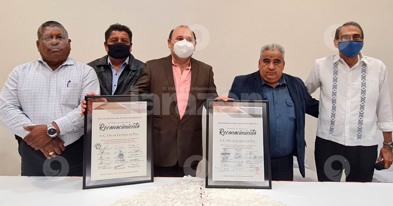 Líderes de transporte, entregan reconocimiento a don Óscar Guzmán de Paz.