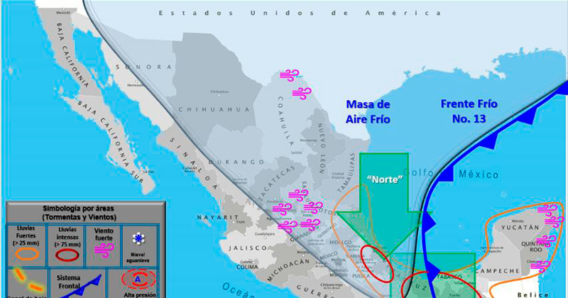 Lluvias y vientos hasta de 35 kilómetros por hora provocará a su paso el frente frío número 13 de la temporada la noche de este domingo y amanecer del lunes